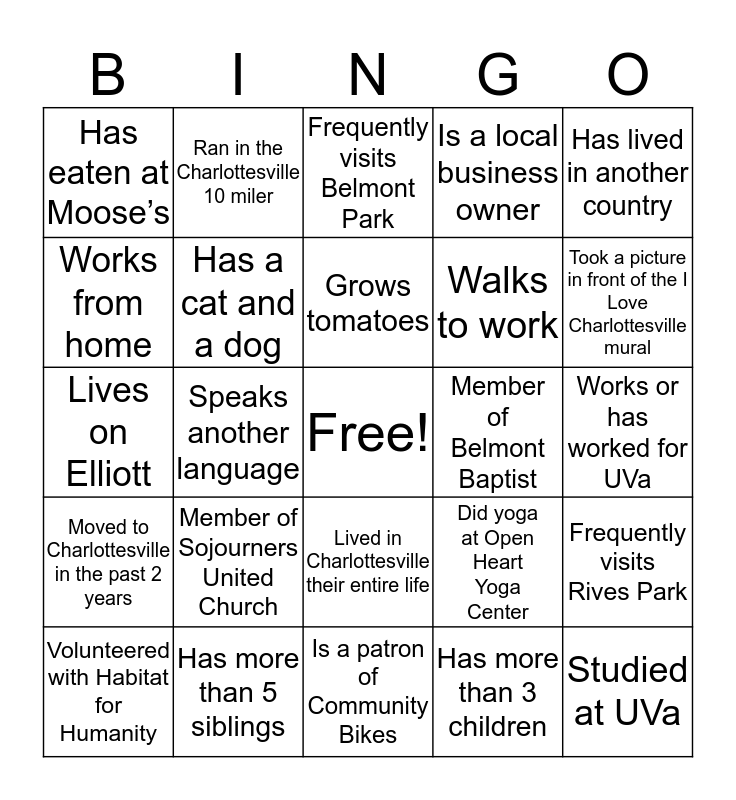 This bingo card has a free space and 40 words: Lives on Avon, Lives on Elliott, Has driven across the country, Has a cat and a dog, Has more than 5 siblings, Lived in Charlottesville their entire life, Grows tomatoes, Keeps chickens, Has lived in another country, Moved to Charlottesville in the past 2 years, Speaks another language, Is a local business owner, Studied at UVa, Works or has worked for UVa, Member of Belmont Baptist, Member of Sojourners United Church, Has 2 children, Has eaten at Moose’s, Is an avid bicyclist, Frequently visits Belmont Park, Frequently visits Rives Park, Has more than 3 children, Walks to work, Works from home, Has seen live music at IX Art Park, Has children who attend Clark Elementary School, Is a photographer (professional or hobbyist), Went to a Tom Tom festival event, Has walked on the Rivanna trail, Has been to the City Market, Served in the military, Volunteered with Habitat for Humanity, Traveled on Amtrak from Charlottesville, Did yoga at Open Heart Yoga Center, Took a picture in front of the I Love Charlottesville mural, Is a patron of Community Bikes, Has eaten at Aqui Es Mexico, Has eaten at Fox’s Cafe, Ran in the Charlottesville 10 miler and Ran in the Charlottesville Marathon.
