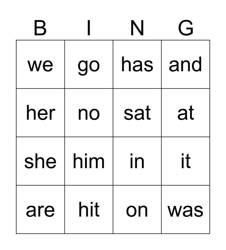 This bingo card has 16 words: hit, it, has, we, she, go, in, on, her, no, are, and, him, at, sat and was.