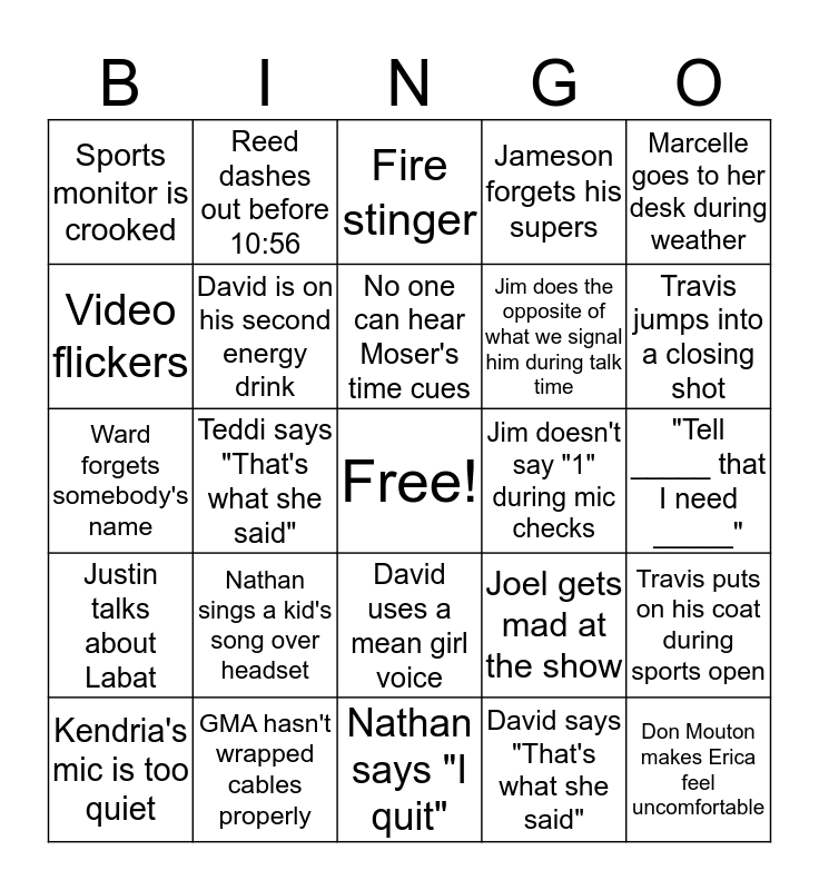 This bingo card has a free space and 49 words: Hannah says meow, Don Mouton makes Erica feel uncomfortable, Derrick talks to Marcelle, Nathan says "I quit", Nathan sings a kid's song over headset, Tiffany's already seen the Harry Potter thing you want to show her, Reed dashes out before 10:56, Jim makes a bad pun, Video flickers, Video is out of sync, David is on his second energy drink, Jameson forgets his supers, Travis puts on his coat during sports open, Joel gets mad at the show, Someone misses a time cue, David rolls his eyes during a Trump story, No one can hear Moser's time cues, Jim doesn't say "1" during mic checks, Rob says "yo yo yo" during mic checks, Marcelle goes to her desk during weather, Teddi says "That's what she said", David says "That's what she said", Sports monitor is crooked, Jim does the opposite of what we signal him during talk time, Rob uses the phrase "misty drizzles", Travis jumps into a closing shot, Kendria's mic is too quiet, Teddi talks about the Kim Kardashian game, David uses a mean girl voice, Justin talks about Labat, Seth rants about a graphic request, Problems with a live shot, A light is out, One or more of the headsets give trouble, GMA hasn't wrapped cables properly, David shoehorns Lord of the Rings into conversation, Wrong VO playing, Wrong super for weather, "Tell _____ that I need _____", "It should be in", "We're missing VO in...", "A-T-Dubba-Dubs", "I don't wanna do ATW", Jim closes one eye when camera is focusing on him, Ward forgets somebody's name, Fire stinger, Danielle says "it's just a bite", Camera operators get sass from Patrice and Master control can't hear us.