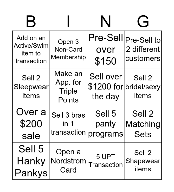 This bingo card has 16 words: Open a Nordstrom Card, Sell 2 Matching Sets, Pre-Sell over $150, Add on an Active/Swim item to transaction, Over a $200 sale, Open 3 Non-Card Membership, Sell 5 panty programs, 5 UPT Transaction, Sell 2 Sleepwear items, Make an App. for Triple Points, Sell 5 Hanky Pankys, Pre-Sell to 2 different customers, Sell 3 bras in 1 transaction, Sell 2 bridal/sexy items, Sell over $1200 for the day and Sell 2 Shapewear items.