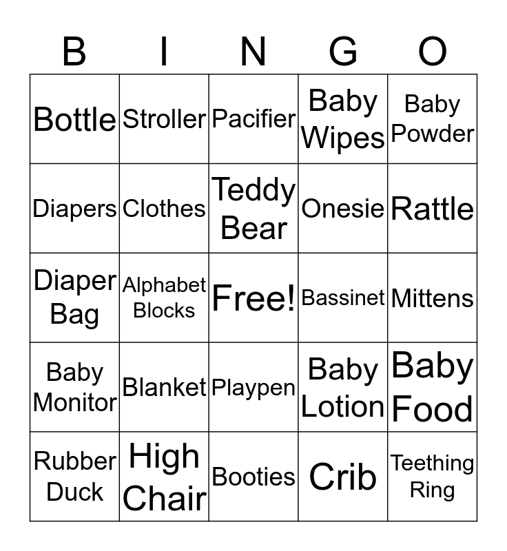 This bingo card has a free space and 24 words: Blanket, High Chair, Teddy Bear, Rubber Duck, Baby Powder, Bottle, Diapers, Stroller, Bassinet, Playpen, Onesie, Diaper Bag, Baby Lotion, Baby Food, Clothes, Crib, Mittens, Pacifier, Rattle, Alphabet Blocks, Teething Ring, Baby Monitor, Baby Wipes and Booties.