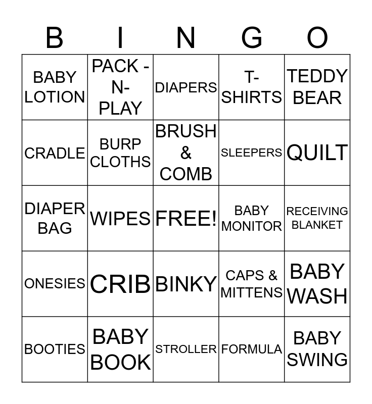 This bingo card has a free space and 24 words: CRIB, BABY BOOK, BRUSH & COMB, BOOTIES, TEDDY BEAR, BABY LOTION, CRADLE, PACK - N- PLAY, BABY MONITOR, BINKY, SLEEPERS, DIAPER BAG, CAPS & MITTENS, BABY WASH, BURP CLOTHS, FORMULA, RECEIVING BLANKET, DIAPERS, QUILT, WIPES, BABY SWING, ONESIES, T-SHIRTS and STROLLER.