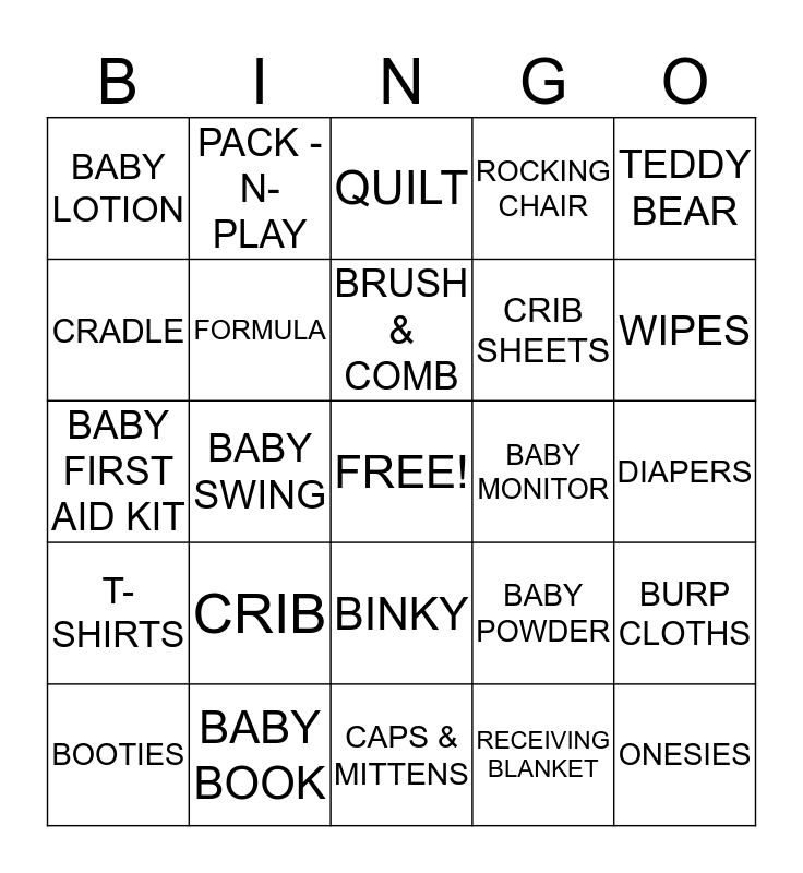 This bingo card has a free space and 24 words: CRIB, BABY BOOK, BRUSH & COMB, BOOTIES, TEDDY BEAR, BABY LOTION, CRADLE, PACK - N- PLAY, BABY MONITOR, BINKY, CRIB SHEETS, BABY FIRST AID KIT, BABY POWDER, BURP CLOTHS, FORMULA, RECEIVING BLANKET, DIAPERS, QUILT, WIPES, BABY SWING, ONESIES, T-SHIRTS, ROCKING CHAIR and CAPS & MITTENS.