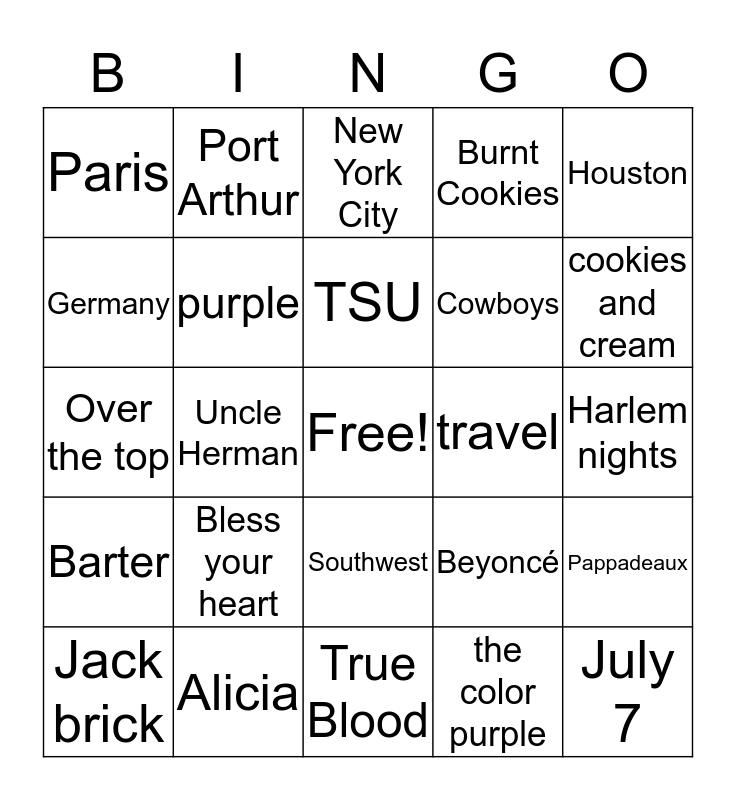 This bingo card has a free space and 24 words: Bless your heart, Alicia, TSU, Jack brick, Houston, Paris, Germany, Port Arthur, travel, Southwest, Cowboys, Over the top, Beyoncé, Pappadeaux, purple, the color purple, Harlem nights, New York City, cookies and cream, Uncle Herman, July 7, Barter, Burnt Cookies and True Blood.
