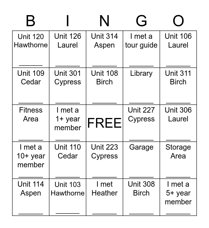 This bingo card has a free space and 24 words: Unit 110 Cedar ______, Unit 103 Hawthorne ______, Unit 108 Birch ______, Unit 114 Aspen ______, Unit 106 Laurel ______, Unit 120 Hawthorne ______, Unit 109 Cedar ______, Unit 126 Laurel ______, Unit 227 Cypress ______, Unit 223 Cypress ______, Library ______, Fitness Area ______, Garage ______, Storage Area ______, Unit 301 Cypress ______, Unit 308 Birch ______, Unit 306 Laurel ______, Unit 314 Aspen ______, Unit 311 Birch ______, I met a 1+ year member ______, I met a 5+ year member ______, I met a 10+ year member ______, I met a tour guide ______ and I met Heather ______.