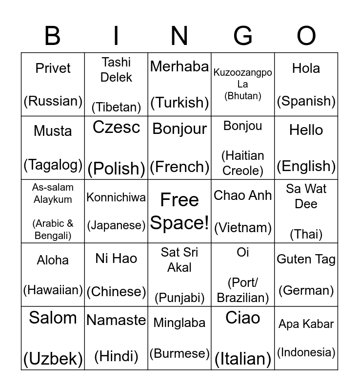 This bingo card has a free space and 24 words: Ni Hao (Chinese), Namaste (Hindi), Bonjour (French), Salom (Uzbek), Hola (Spanish), Privet (Russian), Musta (Tagalog), Tashi Delek (Tibetan), Chao Anh (Vietnam), Sat Sri Akal (Punjabi), Bonjou (Haitian Creole), As-salam Alaykum (Arabic & Bengali), Oi (Port/ Brazilian), Guten Tag (German), Czesc (Polish), Ciao (Italian), Sa Wat Dee (Thai), Merhaba (Turkish), Hello (English), Konnichiwa (Japanese), Apa Kabar (Indonesia), Aloha (Hawaiian), Kuzoozangpo La (Bhutan) and Minglaba (Burmese).