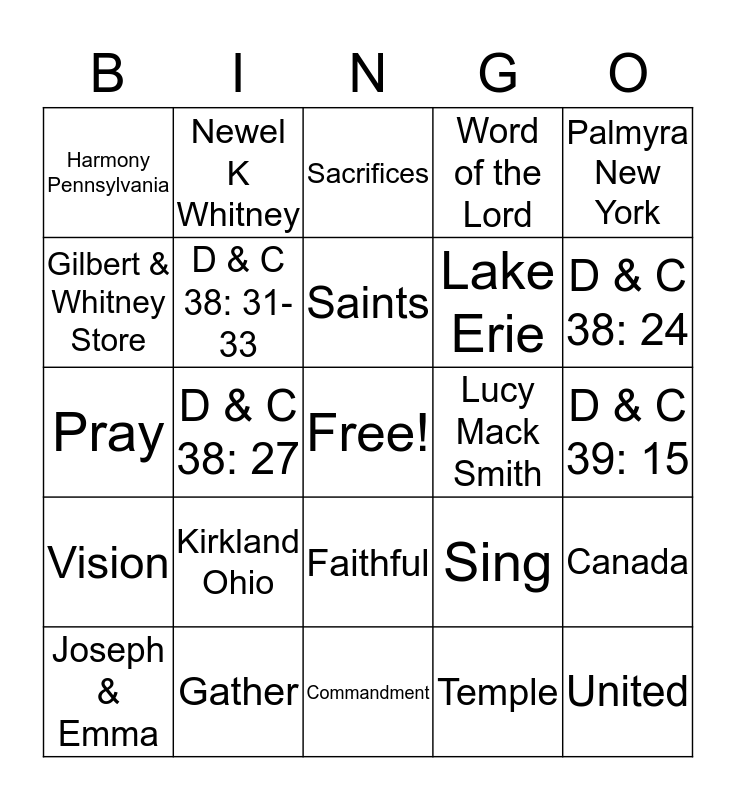 This bingo card has a free space and 24 words: Kirkland Ohio, Gather, Saints, Joseph & Emma, Palmyra New York, Harmony Pennsylvania, Gilbert & Whitney Store, Newel K Whitney, Lucy Mack Smith, Faithful, Lake Erie, Pray, Sing, Canada, D & C 38: 31-33, Temple, D & C 39: 15, Sacrifices, D & C 38: 24, D & C 38: 27, United, Vision, Word of the Lord and Commandment.