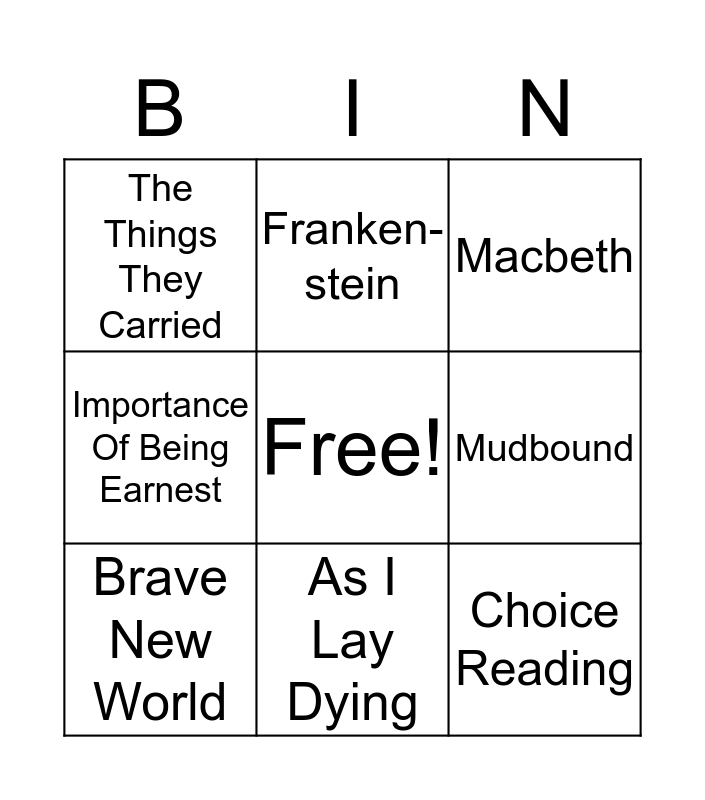 This bingo card has a free space and 8 words: Mudbound, Macbeth, Franken- stein, Brave New World, The Things They Carried, Choice Reading, Importance Of Being Earnest and As I Lay Dying.