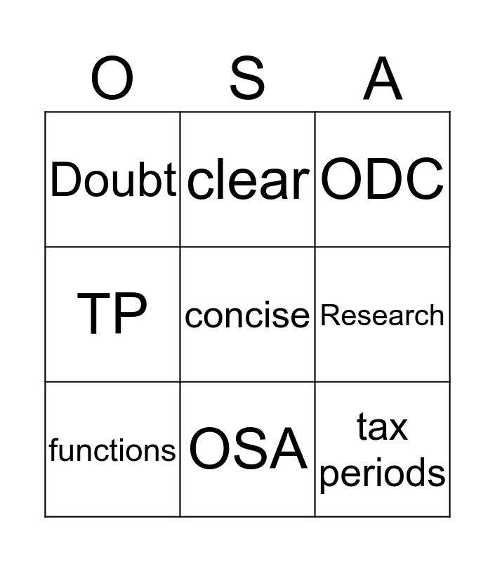 This bingo card has 17 words: DV, tolerance, ODC, Doubt, disclosure, TP, NSD, functions, OSA, Research, Documentation, specific, concise, clear, tax periods, phone number and close.