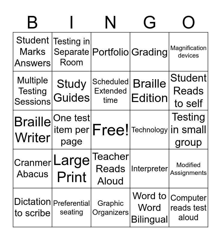 This bingo card has a free space and 24 words: Large Print, Preferential seating, Scheduled Extended time, Dictation to scribe, Magnification devices, Student Marks Answers, Multiple Testing Sessions, Testing in Separate Room, Technology, Teacher Reads Aloud, Braille Edition, Braille Writer, Interpreter, Modified Assignments, Study Guides, Word to Word Bilingual, Testing in small group, Portfolio, Student Reads to self, One test item per page, Computer reads test aloud, Cranmer Abacus, Grading and Graphic Organizers.