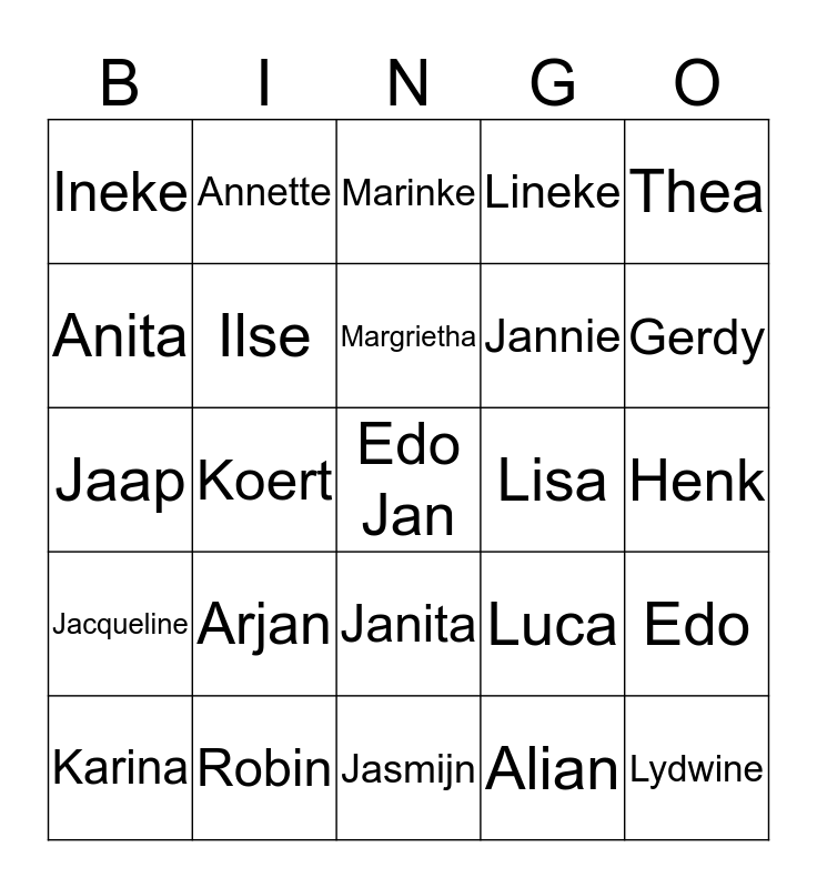 This bingo card has 66 words: Janny, Jitse, Annie, Edo, Minie, Henk Jan, Annette, Bert, Margrietha, Alfons, Janita, Jan, Henk, Thea, Jeanet, Anita, Koert, Ineke, Harm, Jannie, Arjan, Jacqueline, Lineke, Anja, Anneke, Peter, Harma, Roberto, Edo Jan, Aurora, Karina, Marije, Arjen, Jorn, Luca, Robin, Jeanine, Jaap, Alian, Jolien, Ilse, Tom, Lisa, Erwin, Emma, Simon, Gerdy, Rutger, Lydwine, Ester, Mieke, Ellen, Dana, Ezra, Kato, Ruben, Mirjam, Matthijs, Marinke, Jasmijn, Thorsten, Amber, Soraya, Auke Edo, Veerle and Thijmen.