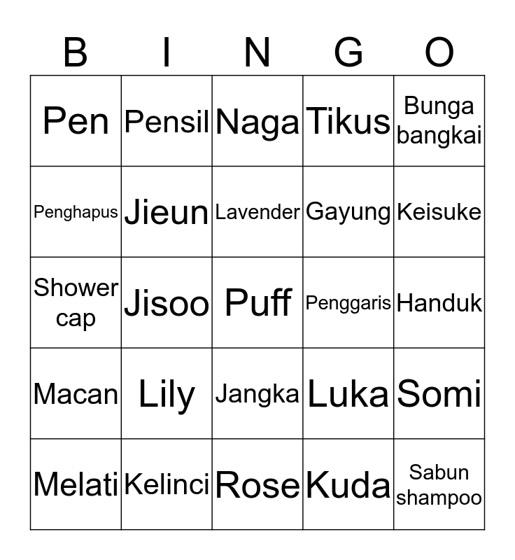 This bingo card has 25 words: Lily, Rose, Lavender, Melati, Bunga bangkai, Pen, Penghapus, Pensil, Penggaris, Jangka, Gayung, Shower cap, Luka, Somi, Jieun, Sabun shampoo, Handuk, Naga, Keisuke, Jisoo, Puff, Kelinci, Macan, Tikus and Kuda.