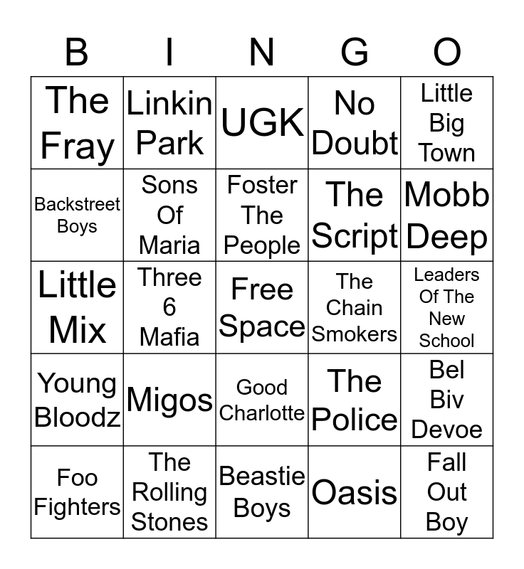 This bingo card has a free space and 24 words: Migos, The Rolling Stones, Foster The People, Foo Fighters, Little Big Town, The Fray, Backstreet Boys, Linkin Park, The Chain Smokers, Good Charlotte, The Script, Little Mix, The Police, Bel Biv Devoe, Sons Of Maria, Oasis, Leaders Of The New School, UGK, Mobb Deep, Three 6 Mafia, Fall Out Boy, Young Bloodz, No Doubt and Beastie Boys.