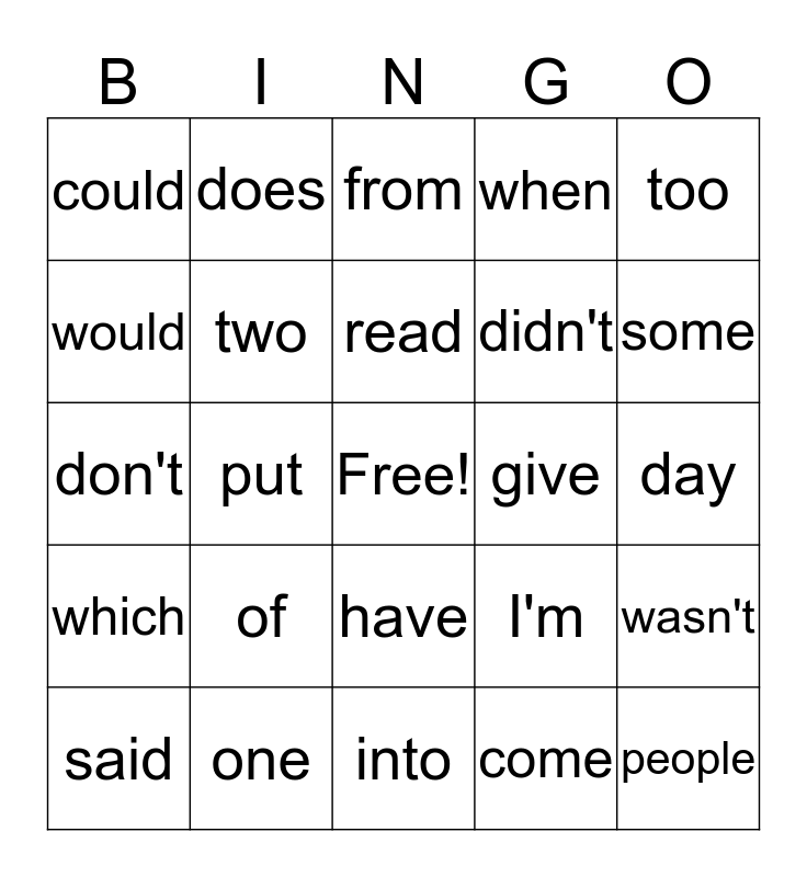 This bingo card has a free space and 24 words: of, one, read, said, too, could, would, does, give, have, didn't, don't, I'm, wasn't, two, come, day, from, some, put, people, which, when and into.