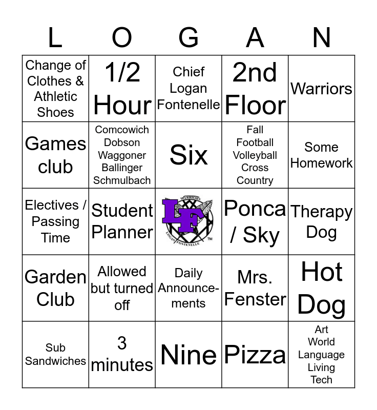 This bingo card has a free space and 24 words: Allowed but turned off, 3 minutes, Six, Sub Sandwiches, Warriors, Change of Clothes & Athletic Shoes, Games club, 1/2 Hour, Ponca / Sky, Daily Announce-ments, Fall Football Volleyball Cross Country, Electives / Passing Time, Mrs. Fenster, Hot Dog, Comcowich Dobson Waggoner Ballinger Schmulbach, Pizza, Therapy Dog, Chief Logan Fontenelle, Some Homework, Student Planner, Art World Language Living Tech, Garden Club, 2nd Floor and Nine.