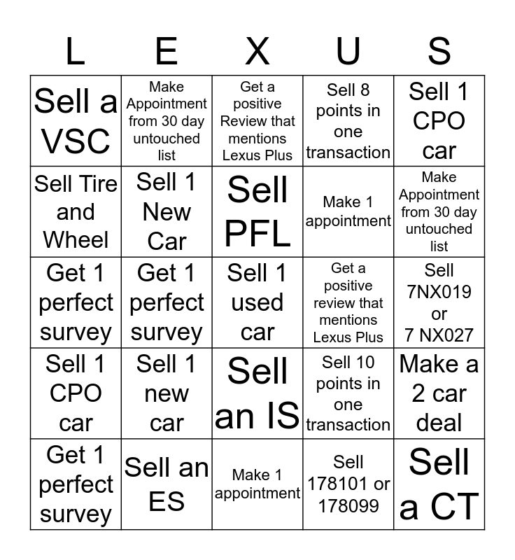 This bingo card has 25 words: Sell 1 new car, Make 1 appointment, Sell PFL, Get 1 perfect survey, Sell 1 CPO car, Sell a VSC, Sell Tire and Wheel, Make Appointment from 30 day untouched list, Get a positive review that mentions Lexus Plus, Sell an IS, Make 1 appointment, Get 1 perfect survey, Sell 10 points in one transaction, Make a 2 car deal, Sell 1 New Car, Sell a CT, Sell 7NX019 or 7 NX027, Get a positive Review that mentions Lexus Plus, Make Appointment from 30 day untouched list, Get 1 perfect survey, Sell 1 used car, Sell an ES, Sell 1 CPO car, Sell 8 points in one transaction and Sell 178101 or 178099.