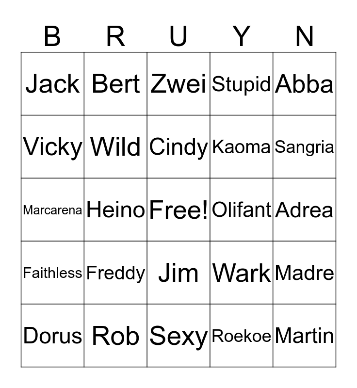 This bingo card has a free space and 24 words: Freddy, Rob, Cindy, Dorus, Abba, Jack, Vicky, Bert, Olifant, Jim, Kaoma, Marcarena, Wark, Madre, Wild, Roekoe, Adrea, Zwei, Sangria, Heino, Martin, Faithless, Stupid and Sexy.