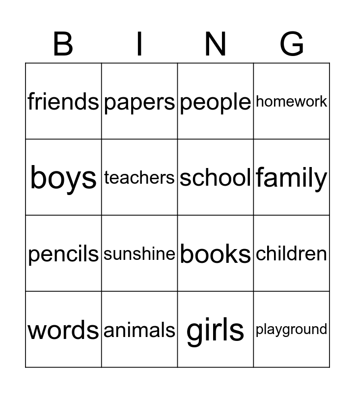 This bingo card has 16 words: animals, children, people, friends, pencils, papers, books, girls, boys, teachers, words, homework, sunshine, family, school and playground.