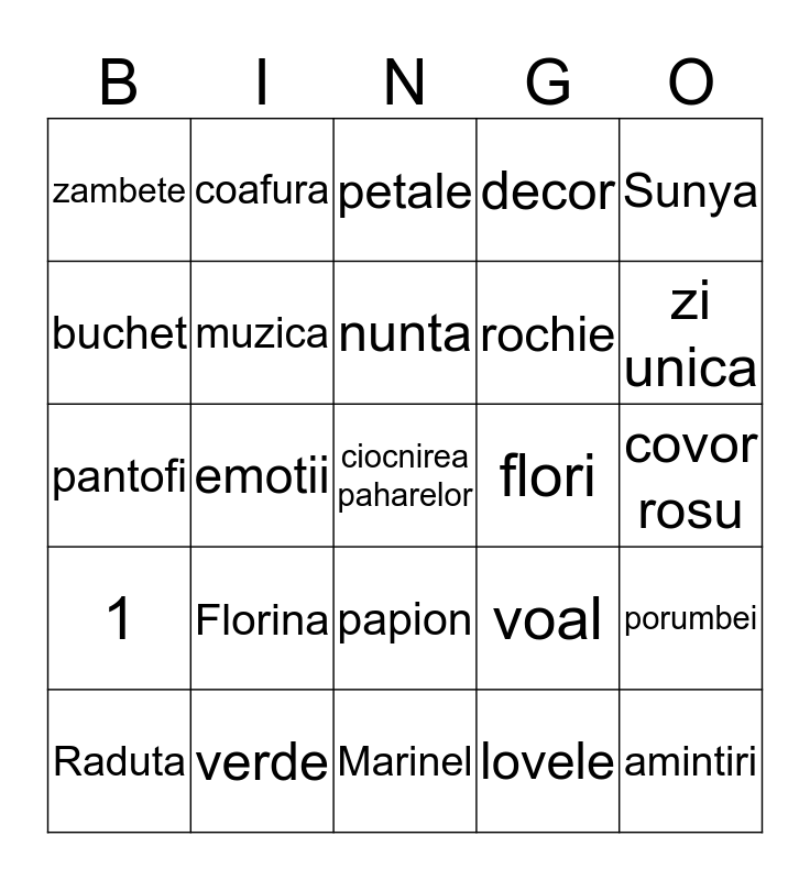 This bingo card has 25 words: Florina, Marinel, nunta, Raduta, Sunya, zambete, buchet, coafura, flori, papion, rochie, pantofi, voal, porumbei, muzica, amintiri, covor rosu, petale, zi unica, emotii, ciocnirea paharelor, verde, 1, decor and lovele.