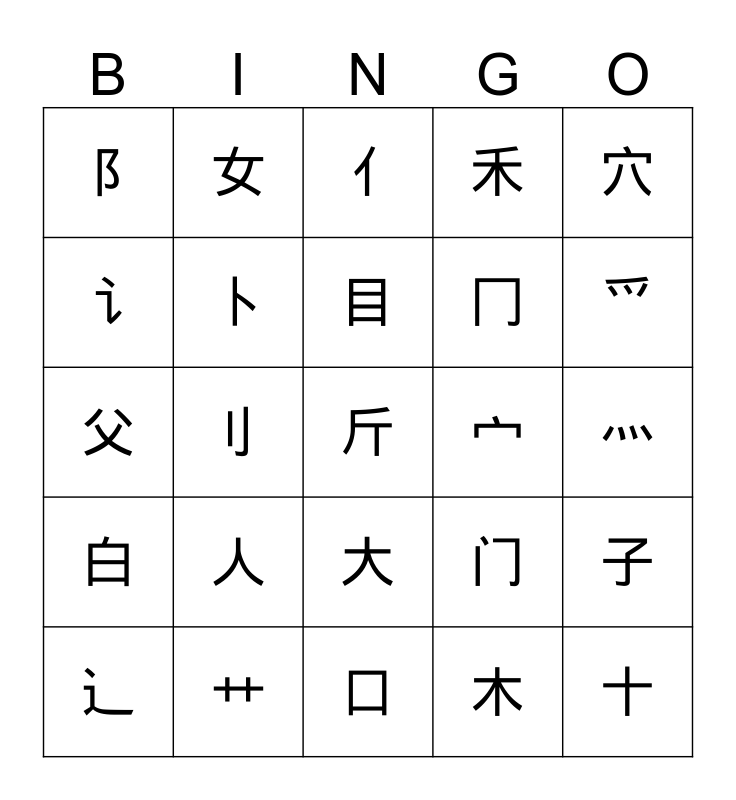 This bingo card has 28 words: 子, 日, 冂, 木, 讠, 亻, 女, 白, 宀, 辶, 父, 禾, 艹, 口, 爫, 丷, 人, 卜, 目, 大, 阝, 十, 斤, 刂, 灬, 门, 穴 and 礻.