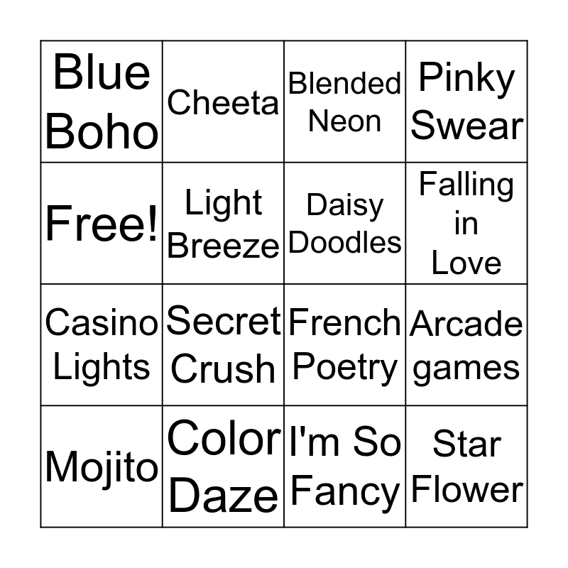 This bingo card has 16 words: Color Daze, Arcade games, Blended Neon, Blue Boho, Casino Lights, Cheeta, French Poetry, I'm So Fancy, Free!, Light Breeze, Mojito, Pinky Swear, Secret Crush, Falling in Love, Daisy Doodles and Star Flower.