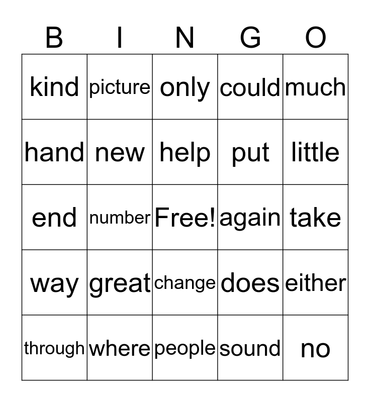 This bingo card has a free space and 24 words: great, where, help, through, much, kind, hand, picture, again, change, put, end, does, either, new, sound, take, only, little, number, no, way, could and people.