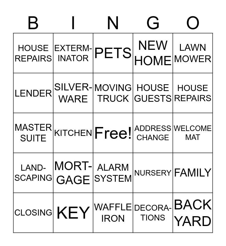 This bingo card has a free space and 24 words: MORT- GAGE, KEY, MOVING TRUCK, CLOSING, LAWN MOWER, HOUSE REPAIRS, LENDER, EXTERM- INATOR, ADDRESS CHANGE, ALARM SYSTEM, HOUSE GUESTS, MASTER SUITE, NURSERY, FAMILY, SILVER- WARE, DECORA- TIONS, WELCOME MAT, PETS, HOUSE REPAIRS, KITCHEN, BACK YARD, LAND- SCAPING, NEW HOME and WAFFLE IRON.