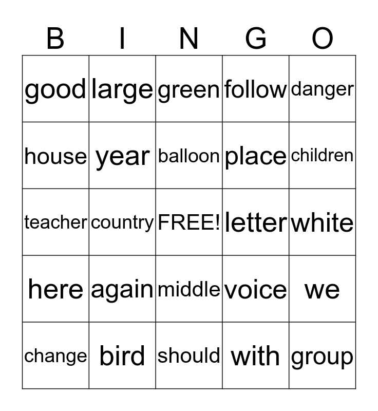 This bingo card has a free space and 24 words: again, bird, balloon, change, danger, good, house, large, letter, middle, place, teacher, voice, we, year, with, white, green, children, country, group, here, follow and should.