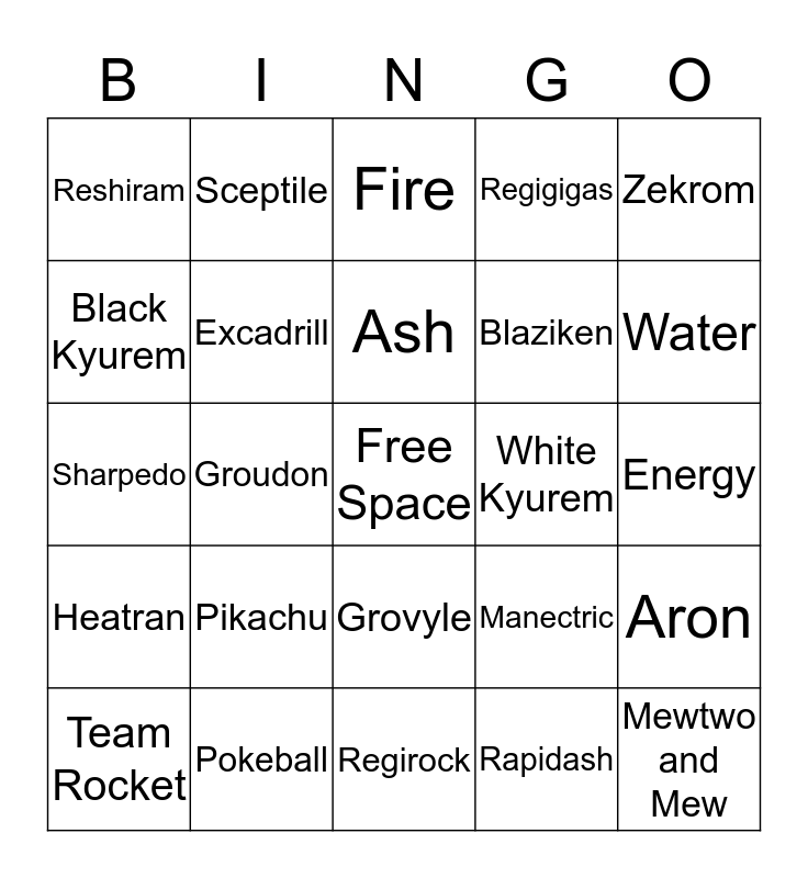 This bingo card has a free space and 24 words: Pikachu, Pokeball, Ash, Team Rocket, Zekrom, Reshiram, Black Kyurem, Sceptile, White Kyurem, Grovyle, Blaziken, Sharpedo, Manectric, Aron, Excadrill, Rapidash, Energy, Fire, Water, Groudon, Mewtwo and Mew, Heatran, Regigigas and Regirock.
