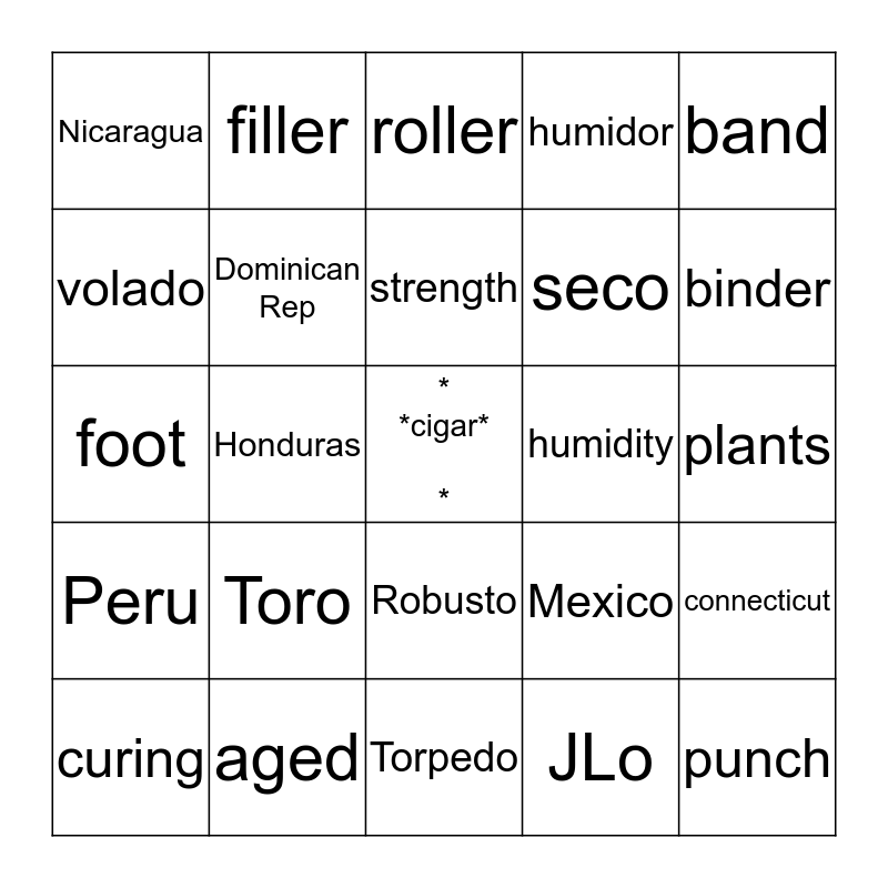 This bingo card has a free space and 45 words: cutter, punch, barn, curing, smoke, JLo, roller, leaf, band, aged, humidor, humidity, Robusto, Toro, Churchill, Torpedo, wrapper, foot, Costa Rica, binder, filler, press, chaveta, Nicaragua, ring gauge, plants, toast, bunch, Mexico, Peru, leaves, connecticut, oscuro, valley, volcanic, Honduras, equator, priming, mild, strength, volado, seco, ligero, Dominican Rep and Brazil.