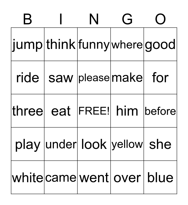 This bingo card has a free space and 24 words: under, came, please, white, good, jump, ride, think, him, look, make, three, yellow, she, saw, over, before, funny, for, eat, blue, play, where and went.
