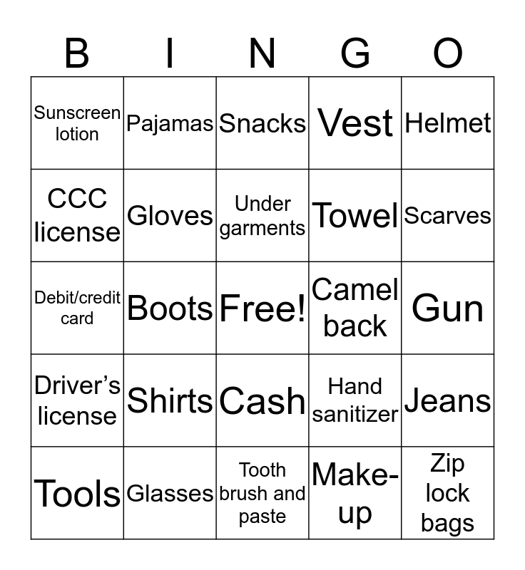 This bingo card has a free space and 37 words: Rain suit and Booties, Latex gloves, Socks, Gloves, Jeans, Shirts, Under garments, Tank tops, Helmet, Cell phone, Boots, Vest, Zip lock bags, Gun, CCC license, Driver’s license, Phone charger, Snacks, Cash, Camel back, Sunscreen lotion, Scarves, Tools, Tooth brush and paste, Jewelry, Make-up, Pajamas, Flash light, Jump box, Water, Shades, Glasses, Debit/credit card, Fan, Hand sanitizer, Towel and Bike cleaner.