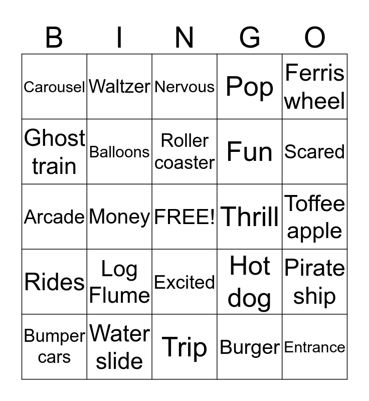 This bingo card has a free space and 24 words: Log Flume, Water slide, Roller coaster, Bumper cars, Ferris wheel, Carousel, Ghost train, Waltzer, Thrill, Excited, Fun, Arcade, Hot dog, Pirate ship, Balloons, Burger, Toffee apple, Nervous, Scared, Money, Entrance, Rides, Pop and Trip.