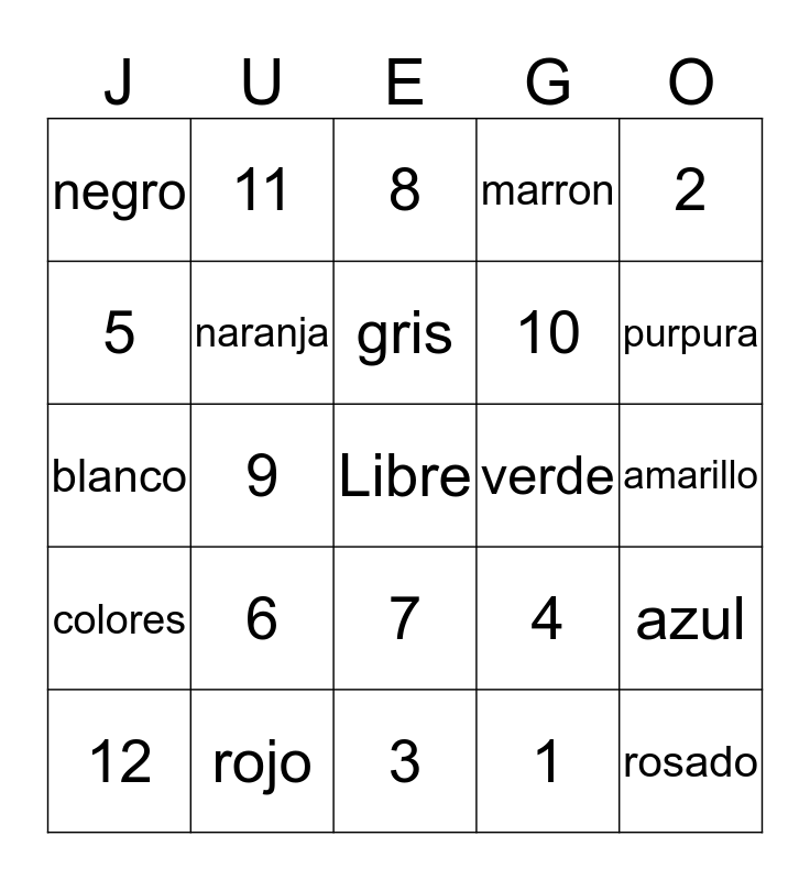 This bingo card has a free space and 24 words: 6, rojo, gris, 12, 2, negro, 5, 11, verde, 7, 10, blanco, 4, azul, naranja, 1, amarillo, 8, purpura, 9, rosado, colores, marron and 3.