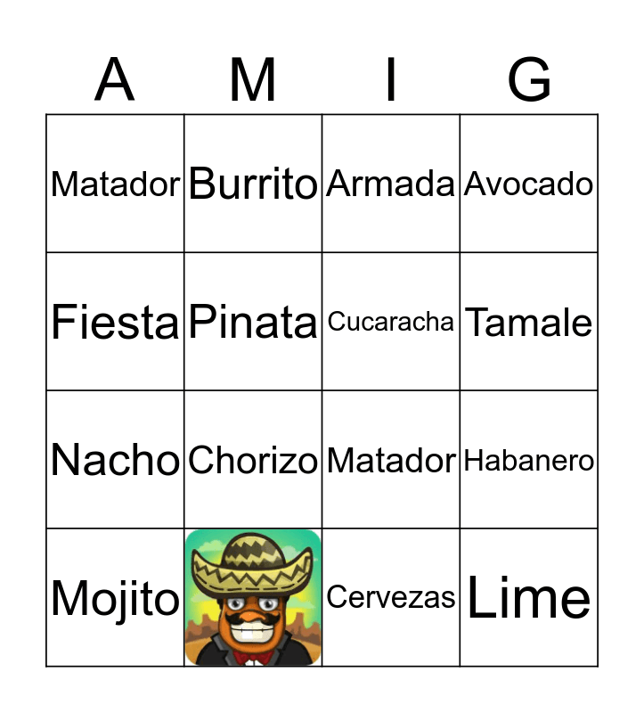 This bingo card has 1 images and 24 words: Salsa, Burro, Tamale, Guacamole, Fiesta, Matador, Pinata, Burrito, Jalapeno, Nacho, Matador, Tequila, Bronco, Cucaracha, Bodega, Cervezas, Armada, Chorizo, Habanero, Mojito, Margarita, Lime, Avocado and Chili.