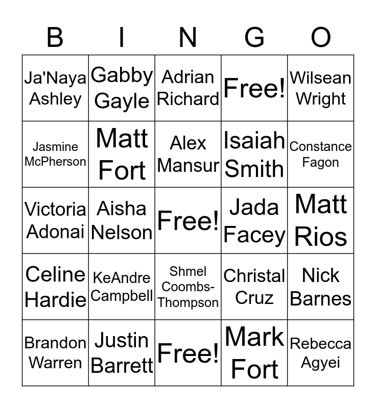 This bingo card has a free space and 24 words: KeAndre Campbell, Justin Barrett, Alex Mansur, Brandon Warren, Wilsean Wright, Ja'Naya Ashley, Jasmine McPherson, Gabby Gayle, Jada Facey, Shmel Coombs-Thompson, Isaiah Smith, Victoria Adonai, Christal Cruz, Nick Barnes, Matt Fort, Mark Fort, Matt Rios, Adrian Richard, Constance Fagon, Aisha Nelson, Rebecca Agyei, Celine Hardie, Free! and Free!.