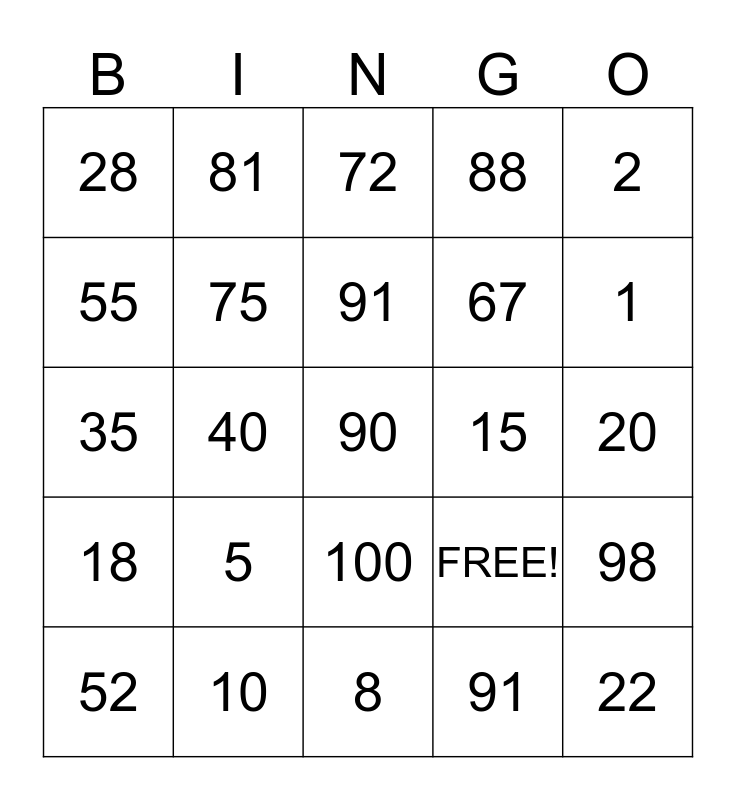 This bingo card has 25 words: 5, 8, 91, 52, 2, 28, 55, 81, 15, 100, 67, 35, FREE!, 98, 75, 22, 20, 72, 1, 40, 90, 10, 18, 88 and 91.