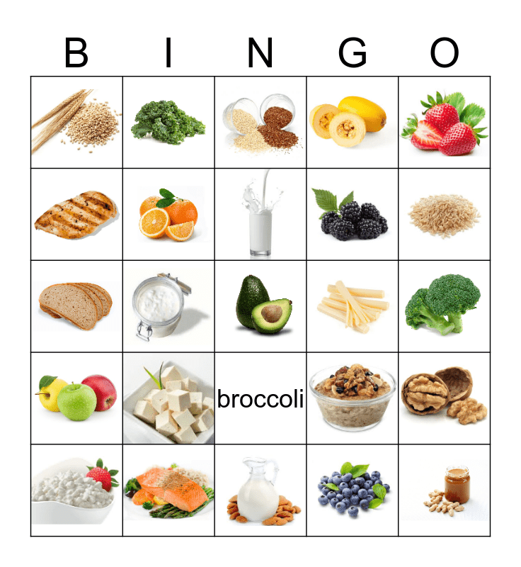 This bingo card has 26 images, a free space and 1 words: broccoli.