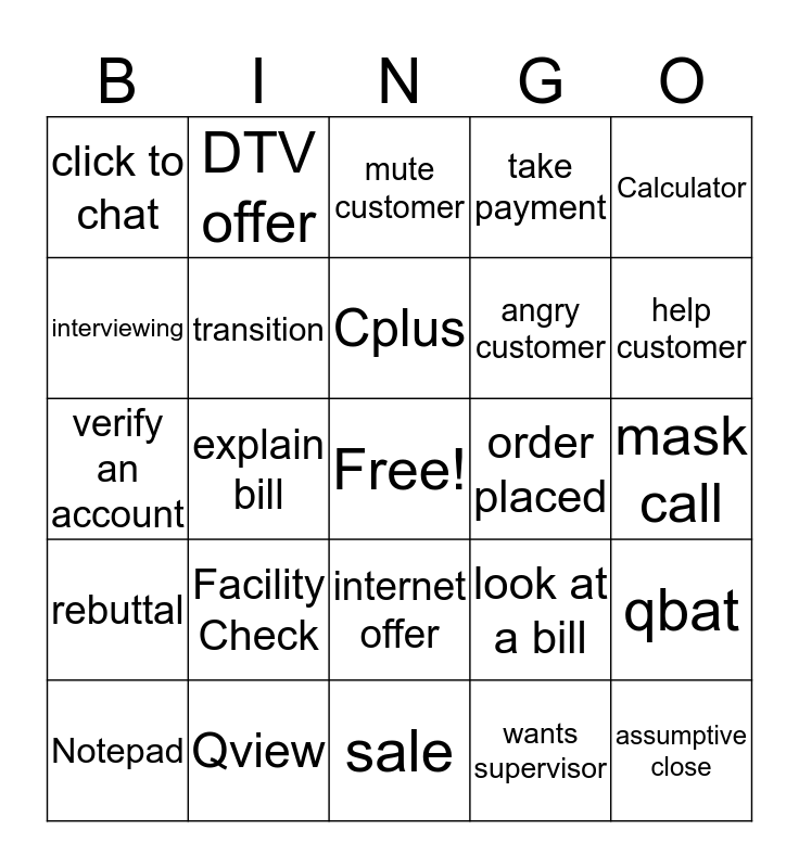 This bingo card has a free space and 24 words: Facility Check, Qview, Cplus, Notepad, Calculator, click to chat, interviewing, DTV offer, order placed, internet offer, angry customer, verify an account, look at a bill, qbat, transition, wants supervisor, mask call, mute customer, help customer, explain bill, assumptive close, rebuttal, take payment and sale.
