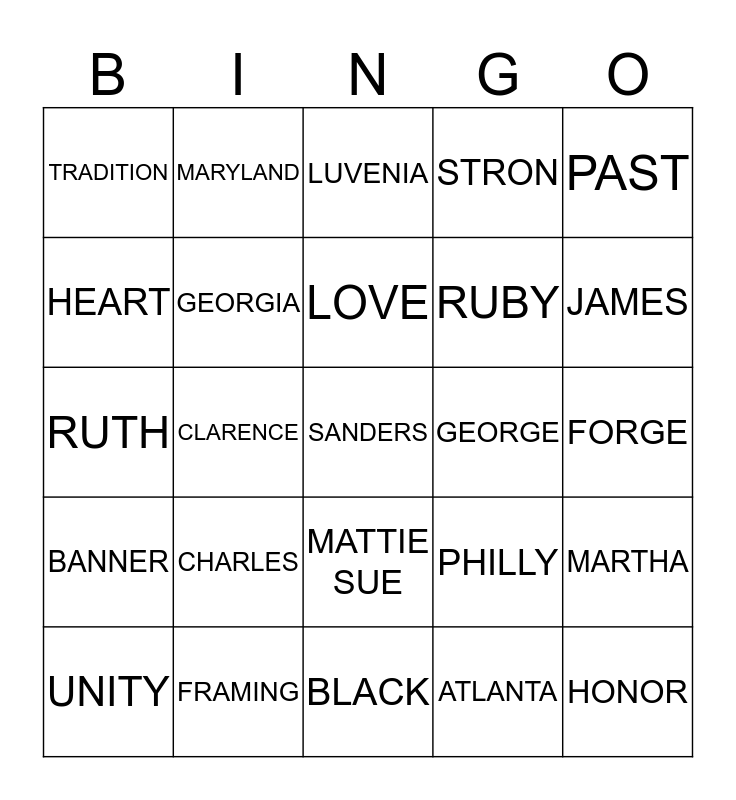 This bingo card has a free space and 24 words: CHARLES, FRAMING, LOVE, UNITY, PAST, TRADITION, HEART, MARYLAND, GEORGE, MATTIE SUE, RUBY, RUTH, PHILLY, MARTHA, GEORGIA, ATLANTA, FORGE, LUVENIA, JAMES, CLARENCE, HONOR, BANNER, STRON and BLACK.