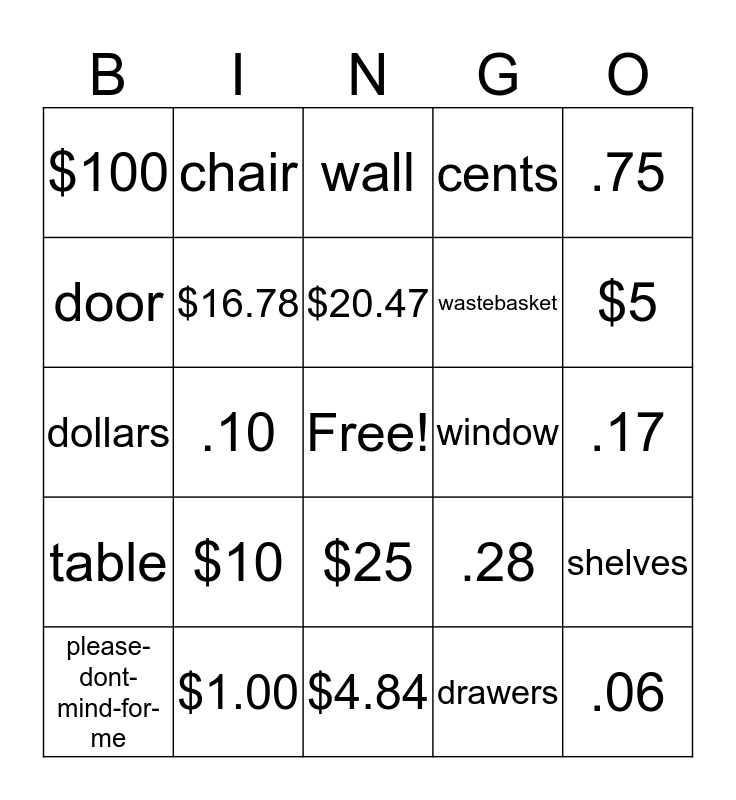 This bingo card has a free space and 28 words: shelves, cabinet, wastebasket, drawers, door, wall, chair, table, window, please-dont-mind-for-me, dollars, cents, $1.00, $4.84, $5, $7.28, $10, $16.78, $20.47, $25, $100, .03, .06, .10, .17, .28, .75 and .98.
