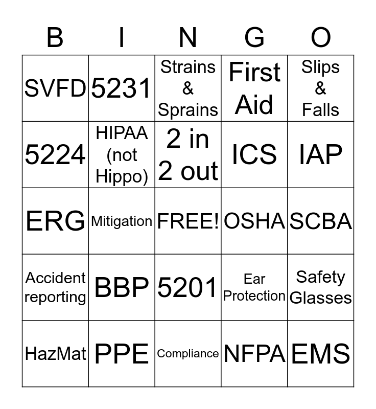 This bingo card has a free space and 24 words: BBP, PPE, 2 in 2 out, HazMat, Slips & Falls, SVFD, 5224, 5231, OSHA, 5201, ICS, ERG, Ear Protection, Safety Glasses, HIPAA (not Hippo), NFPA, SCBA, Strains & Sprains, IAP, Mitigation, EMS, Accident reporting, First Aid and Compliance.