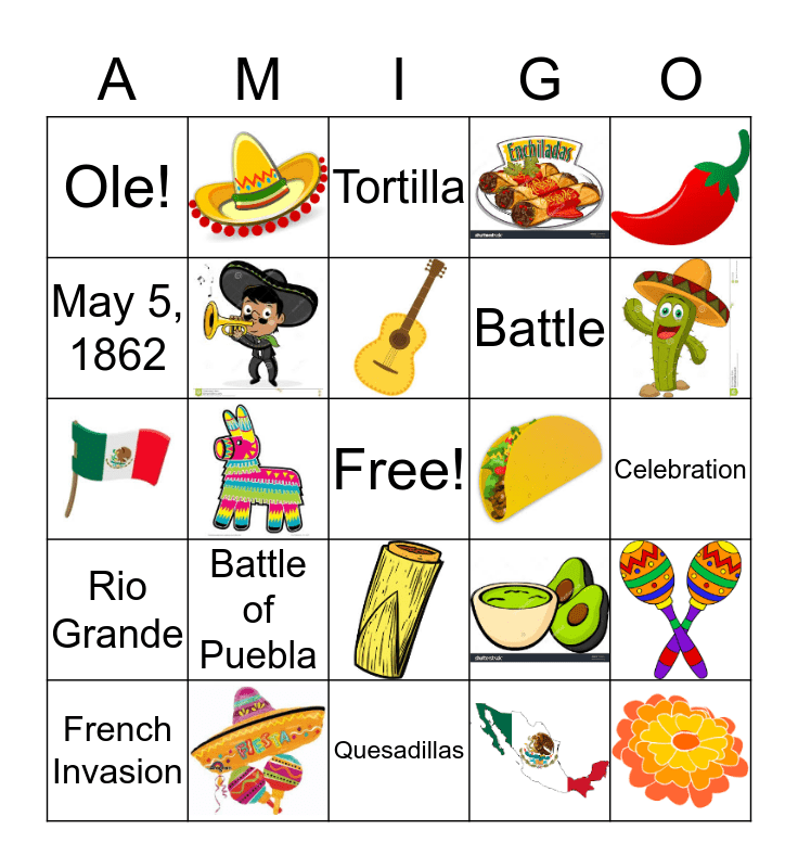This bingo card has 15 images, a free space and 9 words: Battle of Puebla, French Invasion, Ole!, May 5, 1862, Battle, Celebration, Tortilla, Rio Grande and Quesadillas.