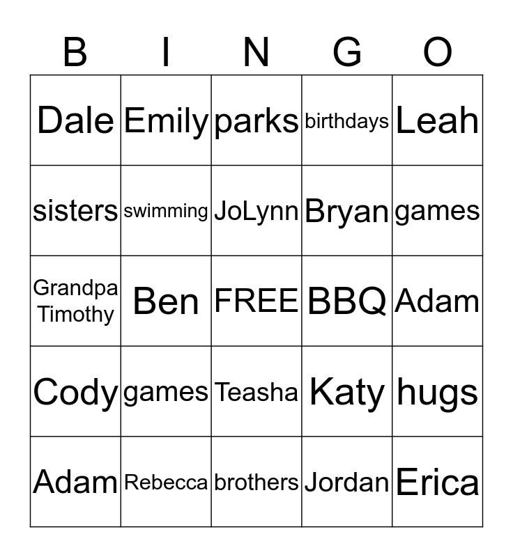 This bingo card has a free space and 24 words: games, Rebecca, JoLynn, Adam, Leah, Dale, sisters, Emily, BBQ, Teasha, Bryan, Grandpa Timothy, Katy, hugs, swimming, Jordan, Adam, parks, games, Ben, Erica, Cody, birthdays and brothers.