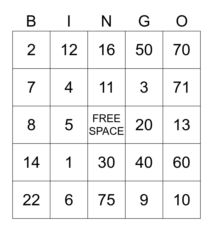 This bingo card has a free space and 24 words: 1, 6, 11, 22, 70, 2, 7, 12, 20, 30, 3, 8, 40, 60, 4, 9, 13, 16, 71, 5, 10, 14, 50 and 75.