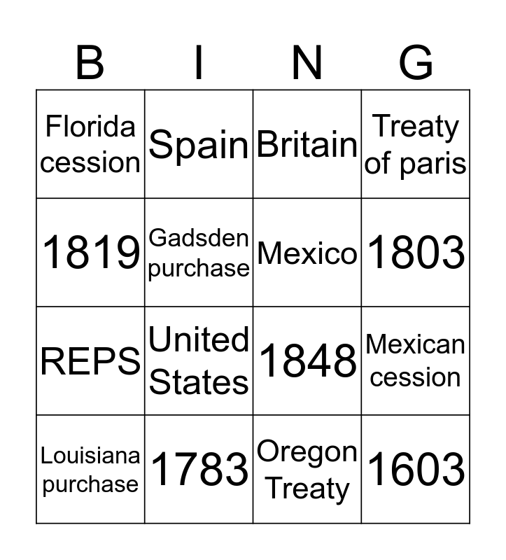 This bingo card has 16 words: 1783, Mexican cession, Britain, Florida cession, REPS, Spain, 1848, Oregon Treaty, 1819, Gadsden purchase, Louisiana purchase, Treaty of paris, United States, 1803, Mexico and 1603.