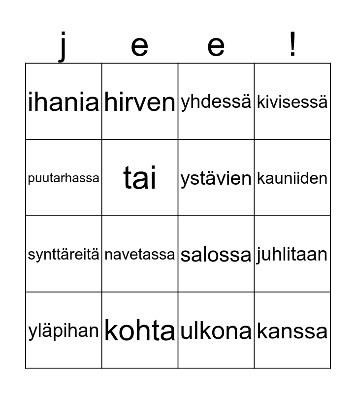 This bingo card has 16 words: kohta, juhlitaan, yhdessä, ihania, synttäreitä, hirven, salossa, ulkona, puutarhassa, tai, yläpihan, kivisessä, navetassa, kauniiden, ystävien and kanssa.