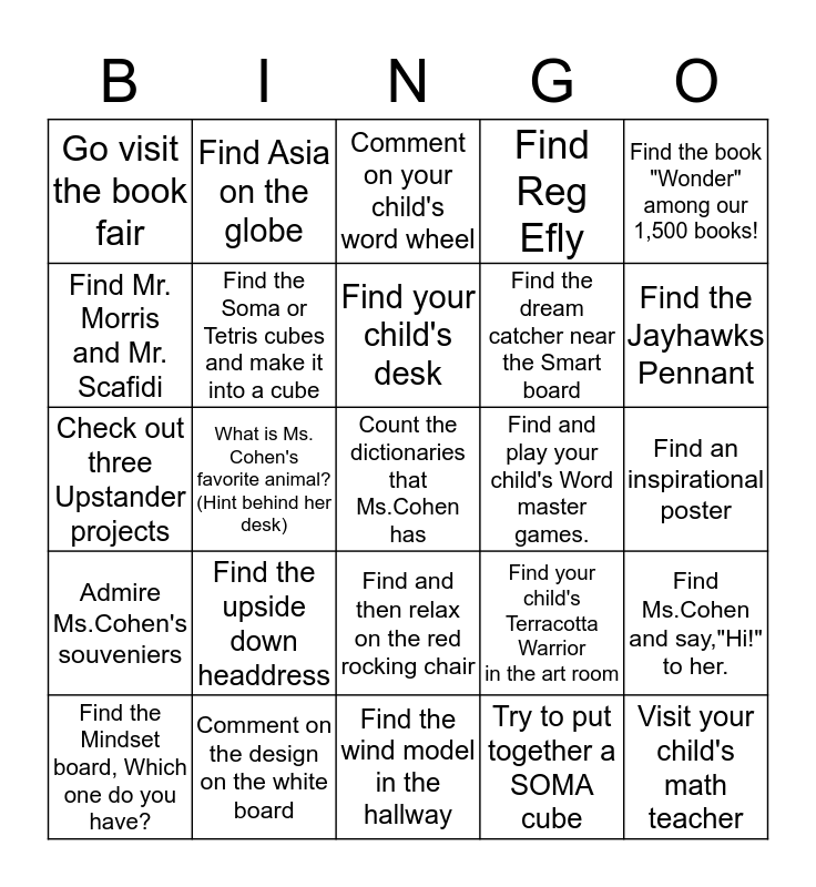 This bingo card has 25 words: Find the upside down headdress, Find the wind model in the hallway, Find your child's desk, Find the Mindset board, Which one do you have?, Find the book "Wonder" among our 1,500 books!, Go visit the book fair, Find Mr. Morris and Mr. Scafidi, Find Asia on the globe, Find and play your child's Word master games., Find and then relax on the red rocking chair, Find the dream catcher near the Smart board, Check out three Upstander projects, Find your child's Terracotta Warrior in the art room, Find Ms.Cohen and say,"Hi!" to her., Find the Soma or Tetris cubes and make it into a cube, Visit your child's math teacher, Find an inspirational poster, Comment on your child's word wheel, Find the Jayhawks Pennant, What is Ms. Cohen's favorite animal?(Hint behind her desk), Count the dictionaries that Ms.Cohen has, Comment on the design on the white board, Admire Ms.Cohen's souveniers, Find Reg Efly and Try to put together a SOMA cube.