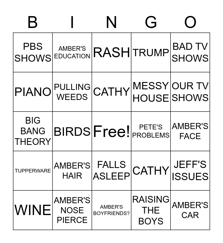 This bingo card has a free space and 24 words: AMBER'S HAIR, AMBER'S NOSE PIERCE, CATHY, WINE, BAD TV SHOWS, PBS SHOWS, PIANO, AMBER'S EDUCATION, PETE'S PROBLEMS, FALLS ASLEEP, MESSY HOUSE, BIG BANG THEORY, CATHY, JEFF'S ISSUES, PULLING WEEDS, RAISING THE BOYS, AMBER'S FACE, RASH, OUR TV SHOWS, BIRDS, AMBER'S CAR, TUPPERWARE, TRUMP and AMBER'S BOYFRIENDS?.