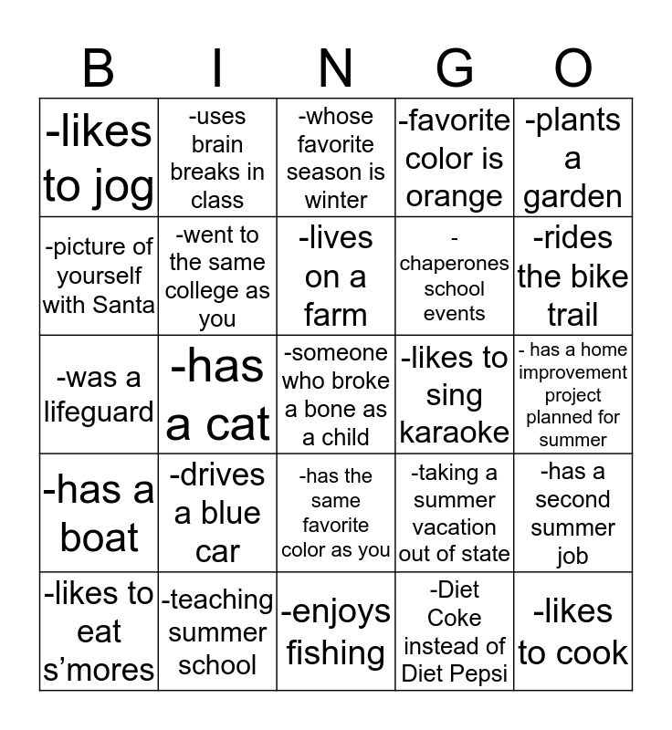 This bingo card has 36 words: Free!, likes to go camping, -favorite flavor of ice cream is mint chocolate chip, -went to the same college as you, -taking a summer vacation out of state, -has a boat, -lives on a farm, -likes the Packers, -plants a garden, -has 2 dogs, -has a cat, -favorite color is orange, -has lived out of state, -likes to sing karaoke, -rides the bike trail, -likes to jog, -likes to cook, -drives a blue car, -someone who broke a bone as a child, -whose favorite season is winter, - has a home improvement project planned for summer, -has a second summer job, -teaching summer school, -likes to eat s’mores, -enjoys fishing, -uses brain breaks in class, -was a lifeguard, -dresses up for Homecoming, -chaperones school events, -picture of yourself with Santa, -volunteers in the community, -favorite food is pizza, -Diet Coke instead of Diet Pepsi, -has the same favorite color as you, -exercises at least 5 days a week and -likes the beach.
